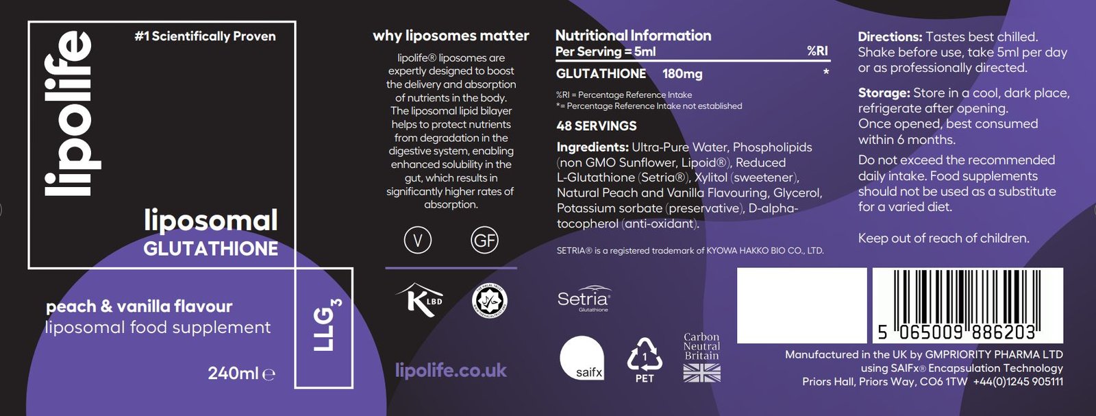 Η κατάσταση της γλουταθειόνης μέσα στα κύτταρα είναι ένας πολύ καλός δείκτης της συνολικής υγείας. Η συμπλήρωση με λιποσωμική γλουταθειόνη εξασφαλίζει καλύτερη βιοδιαθεσιμότητα ενός τυπικά ελάχιστα απορροφούμενου θρεπτικού συστατικού. Γνωστή ως το κύριο αντιοξειδωτικό, η γλουταθειόνη είναι ο κύριος μηχανισμός του σώματος για την εξουδετέρωση των ελεύθερων ριζών.
