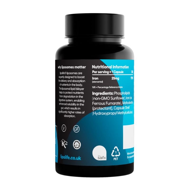 Σίδηρος ως φουμαρικός σε λιποσωμιακή μορφή για 100% απορρόφηση σε κάψουλες για εύκολη κατάποση. Σύνθεση ήπια στο στομάχι. Κατάλληλο για vegan.